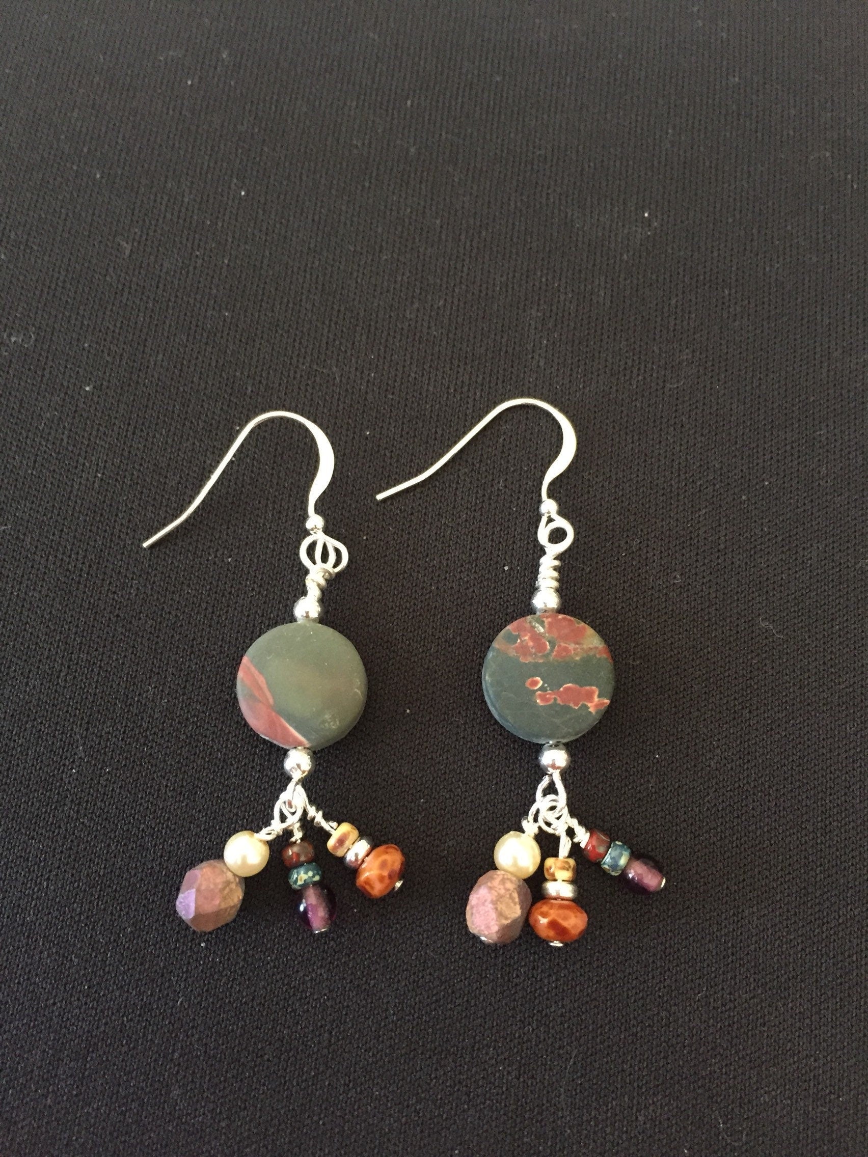 Earthy fall colors of greens and tans in these matte Jasper coin bead dangles.